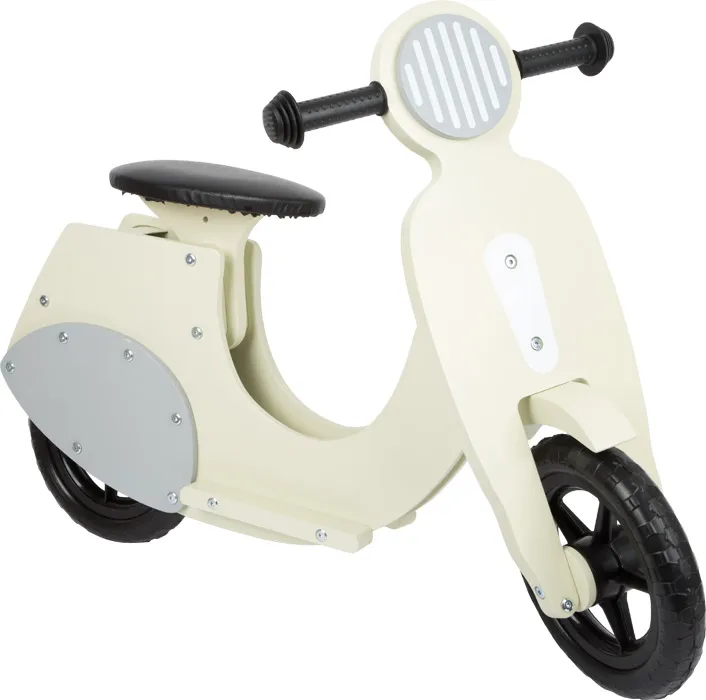 In the nostalgic design of 1950‘s scooters, the stylish learner‘s bike is a real town and country runabout for young people! Made from multiplex wood and beech to be especially sturdy, it offers hours of riding fun! Full-rubber tyres ensure good riding comfort, while rubber grips with stop rings prevent hands from getting scraped or objects getting damaged. The saddle is height adjustable. The steering angle of the steering wheel is limited, thereby restricting the chance of falling off.